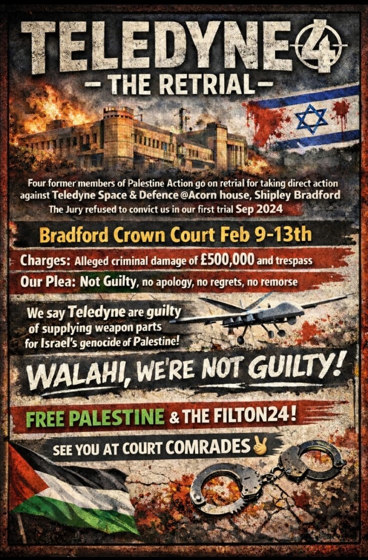- Your Party Bradford calling on support for the Teledyne 4, four former members of Palestine Action who took action against the Teledyne arms factory, and who are now facing a retrial at Bradford Crown Court.