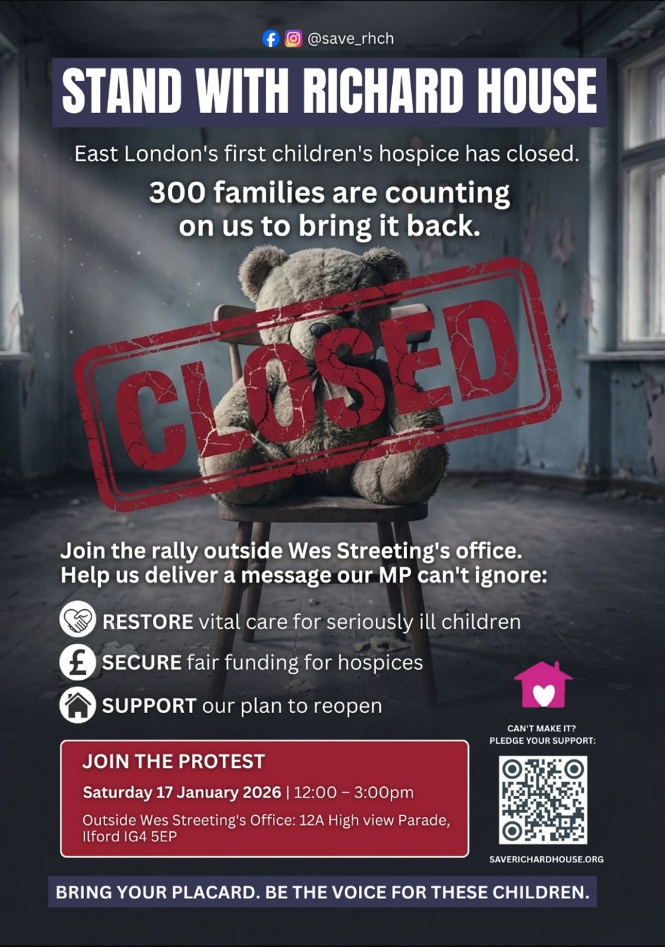 Your Party Stratford & Bow are taking on Wes Streeting. They’re supporting The Save Richard House campaign and are asking folks to show up for a rally outside Streeting’s office (12A High View Parade, Ilford, IG4 5EP) on Saturday 17th January, @ 12pm. Organisers are demanding the reopening of London’s Oldest Children’s Hospice, Richard House, which provides vital care for seriously ill children and supports over 300 families.
