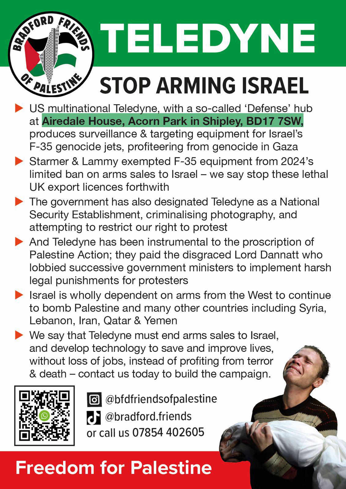 • A call to action against Teledyne (in Shipley, Bradford), an arms factory supplying Israel’s genocide who also lobbied ministers to get Palestine Action proscribed