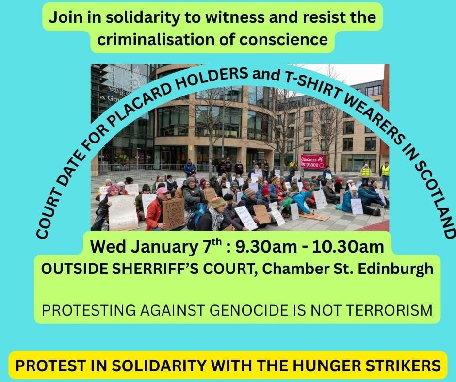 They’re also letting people know that there’s a demo outside Sherriff’s Court, Chamber Street. Edinburgh, on Wednesday 7th January, starting at 9.30am. Apparently its a ‘court date for placard holders and T-shirt wearers’ protesting the genocide of the people of Gaza.