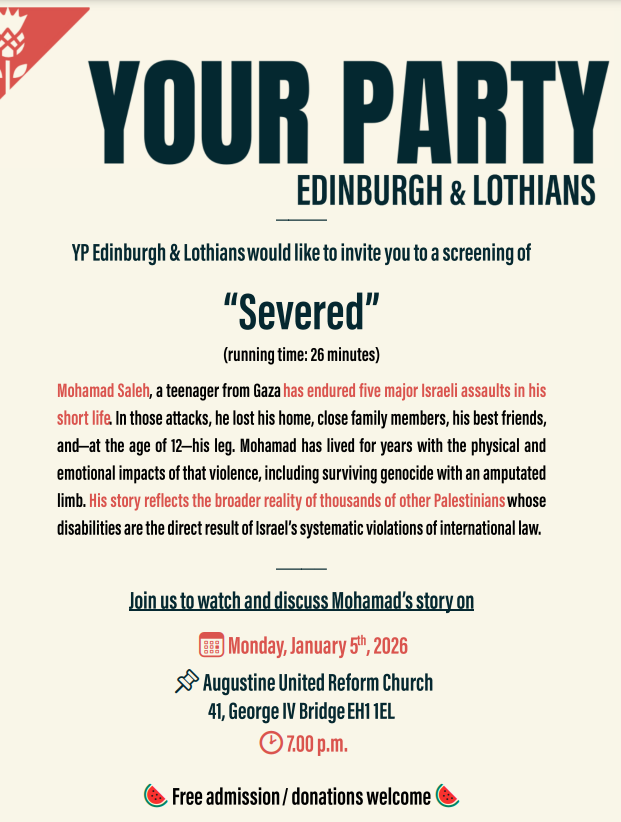 Edinburgh & Lothians Your Party would like to invite everyone to a screening of the film “Severed,” followed by a short discussion. The showing is on the 5th January, 2026. at the Augustine United Reform Church, 41 George IV Bridge EH1 1EL.